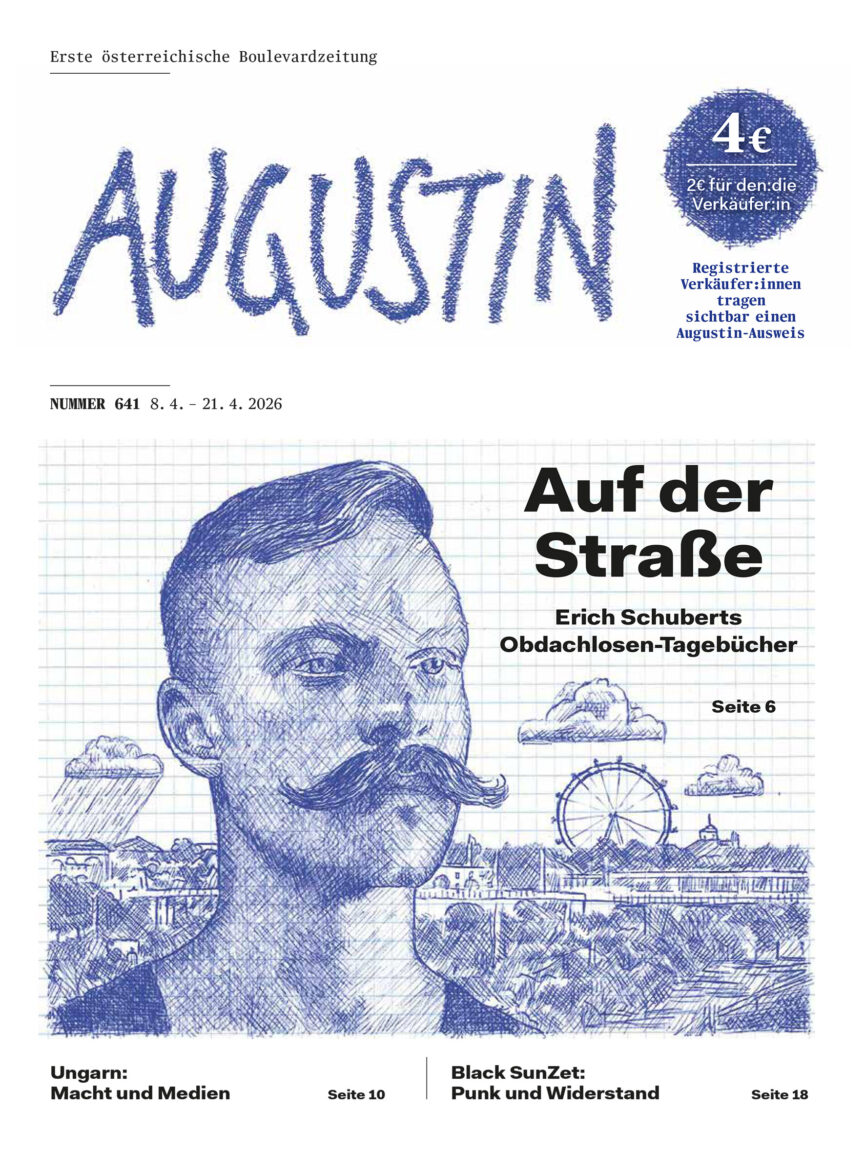Um ein Casting ganz anderer Art geht es dagegen in unserer Titelgeschichte. Mareike Boysen (Text) und Nina Strasser (Fotos) haben sich am Rande eines internationalen Wettbewerbs in Liesing herumgetrieben, um mehr über Casting zu erfahren – eine Art «Turnierangeln auf der Wiese». Das Ergebnis ist nicht nur eine ausnehmend lesenswerte Reportage (S. 18), es wirkt darüber hinaus auch noch dem «dramatischen Anerkennungsproblem» dieses «Randsports unter den Randsportarten» entgegen. Der Herr über die Vorstadt, Kollege Schachner, hat es sich obendrein nicht nehmen lassen, Boysens Text für unsere acht- bis zwölfjährigen Leser_innen zu adaptieren (Seite 26). Das AUGUSTINCHEN, also die Kinderseiten im AUGUSTIN, sind in der vorliegenden Ausgabe übrigens zum vorerst letzten Mal vertreten – wobei eine Wiederaufnahme durchaus im Bereich des Möglichen, wenn nicht gar Wahrscheinlichen liegt. Wir halten Sie informiert.